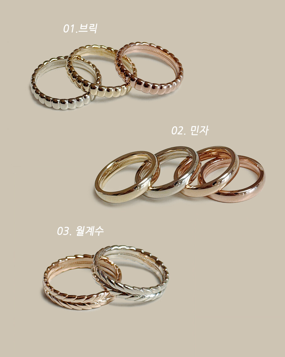 - 민자, 브릭, 월계수 세가지 디자인에 옐로우골드, 베이지골드, 핑크골드, 화이트골드(무도금) 컬러 제작이 가능해서 아주 다양한 레이어드가 가능합니다.