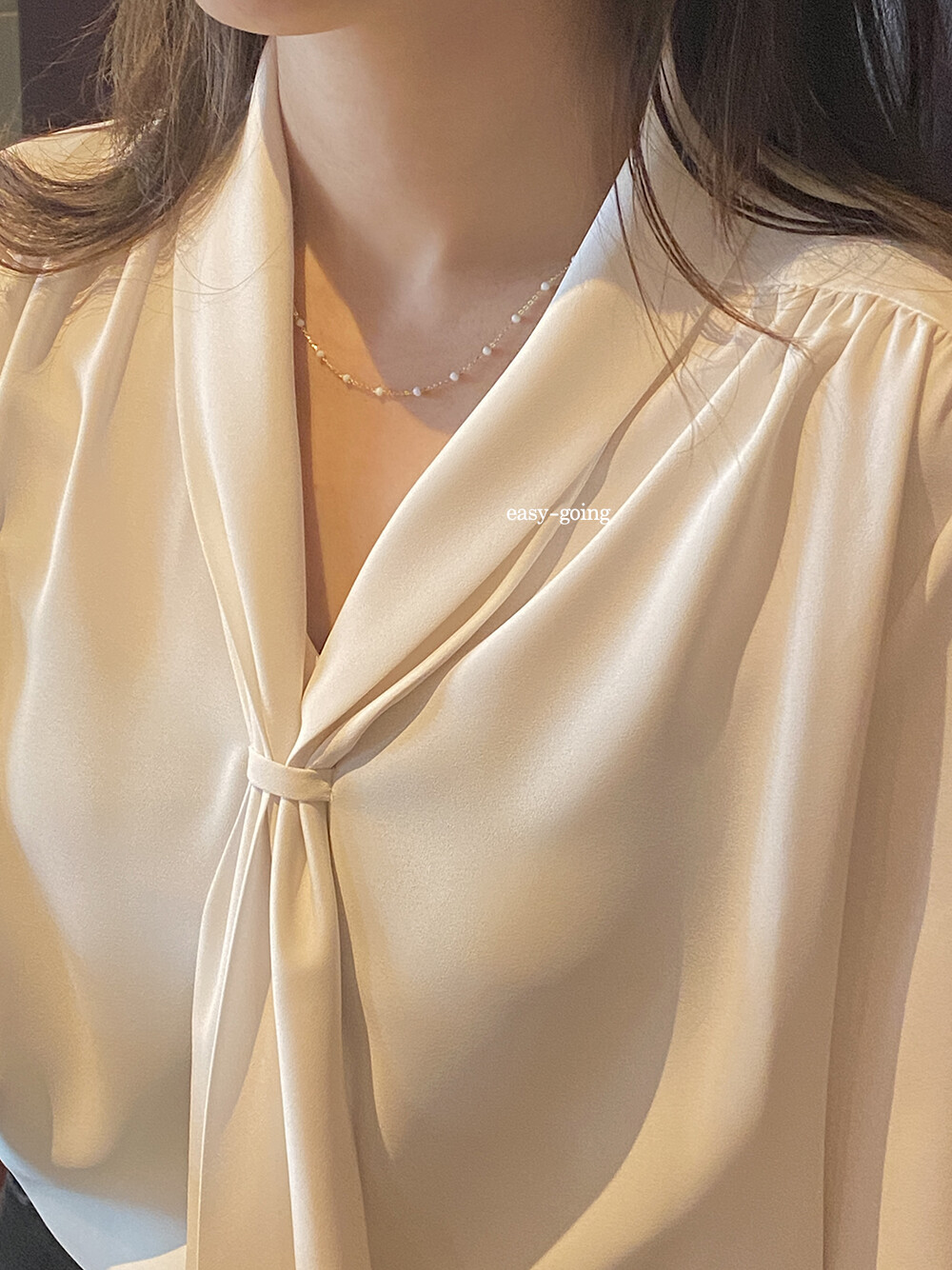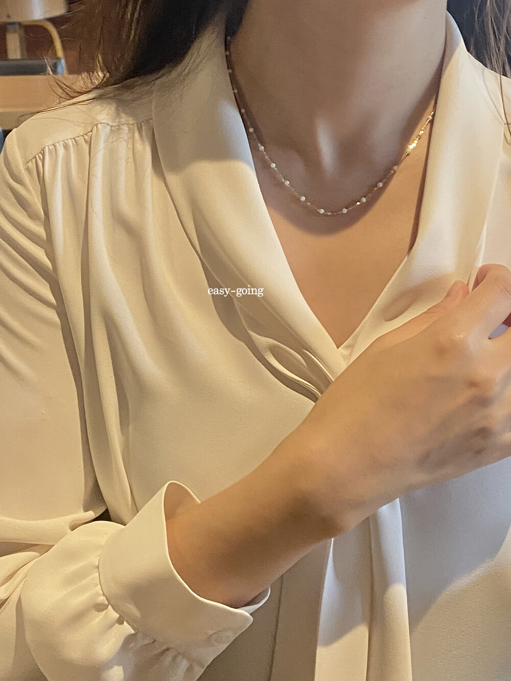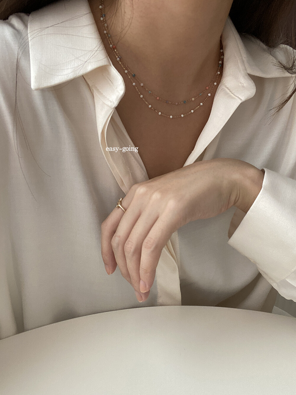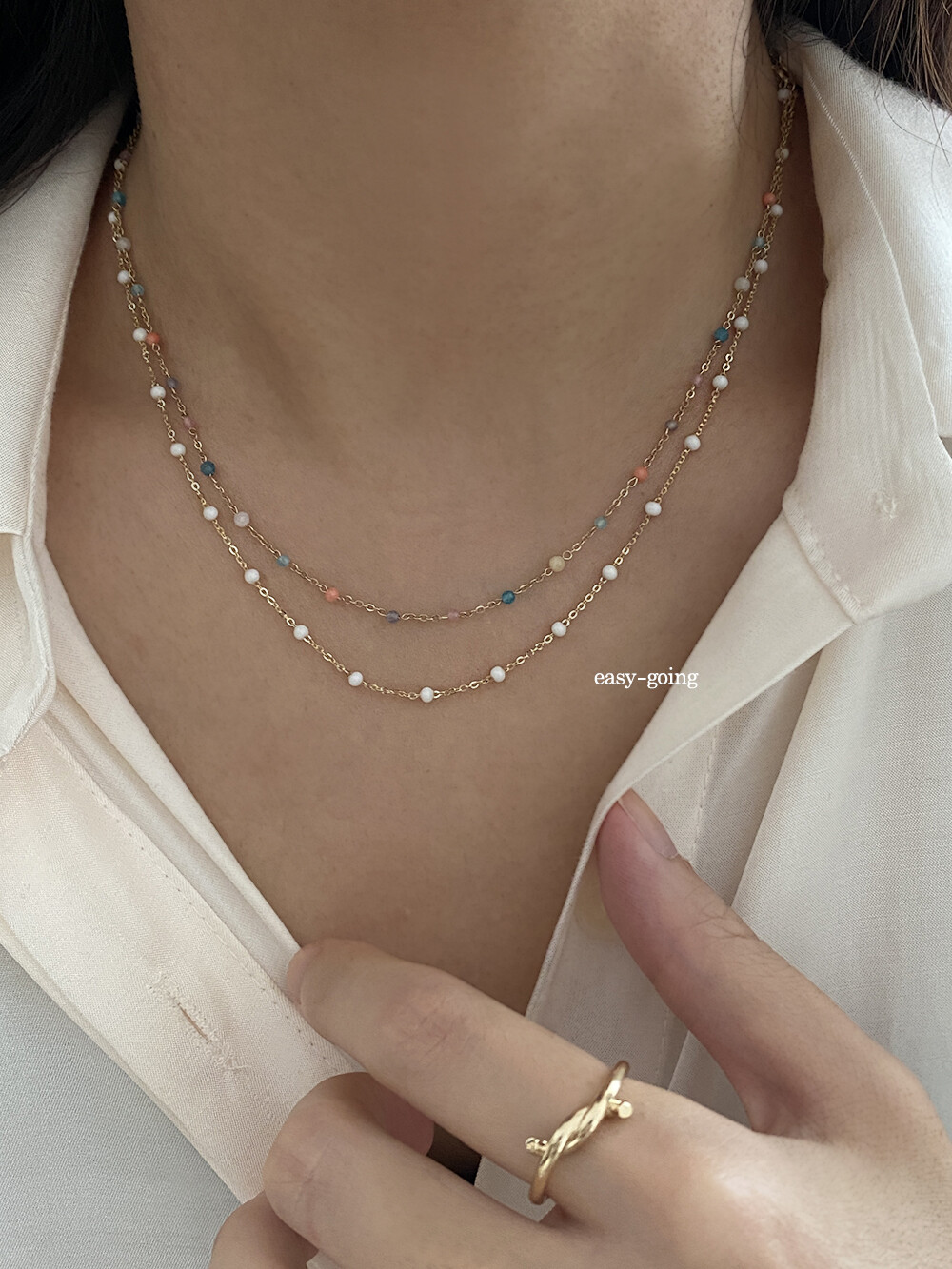 - 착용 제품은 목걸이: 14k 골드 - 화이트/ 42cm(40영고리)