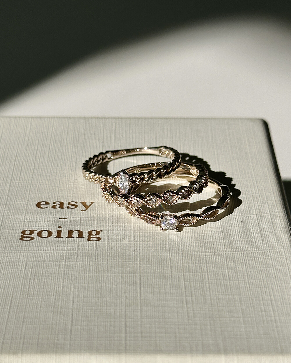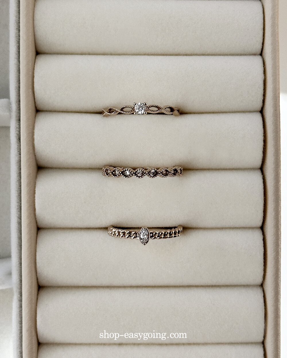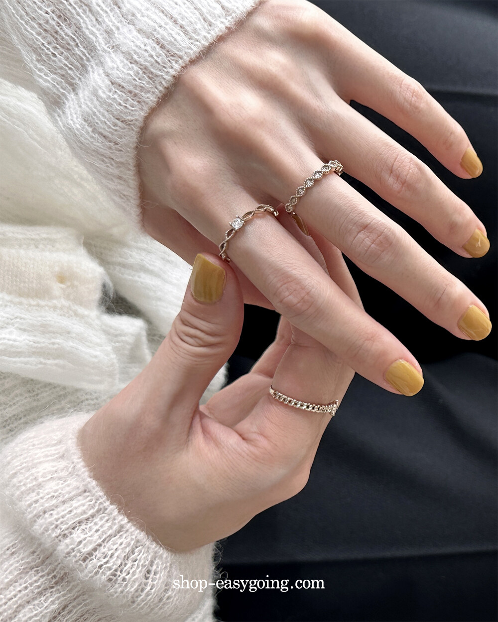 - 단독으로 또는 레이어드 해서 두루두루 매치하기 좋은 반지들이예요 큐빅 포인트로 잔잔하게 화사함도 주었고요 데일리로 편안하게 착용하기 좋으실 거예요 촬영 제품들은 모두 14k 화이트(무도금) 컬러인데요 빈티지한 느낌도 들면서 디자인과 잘 어울렸어요♡