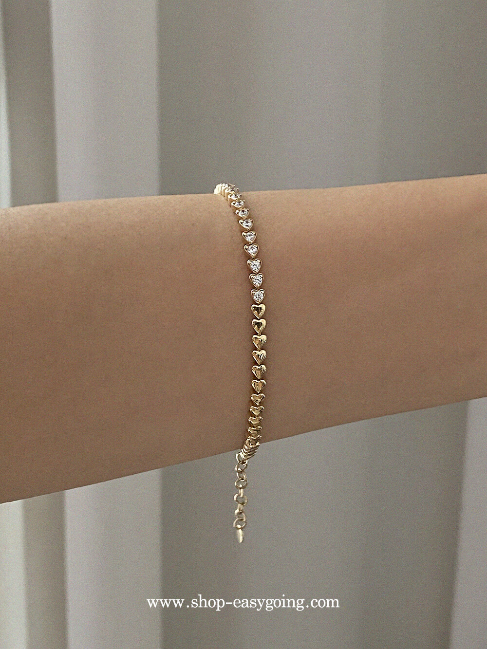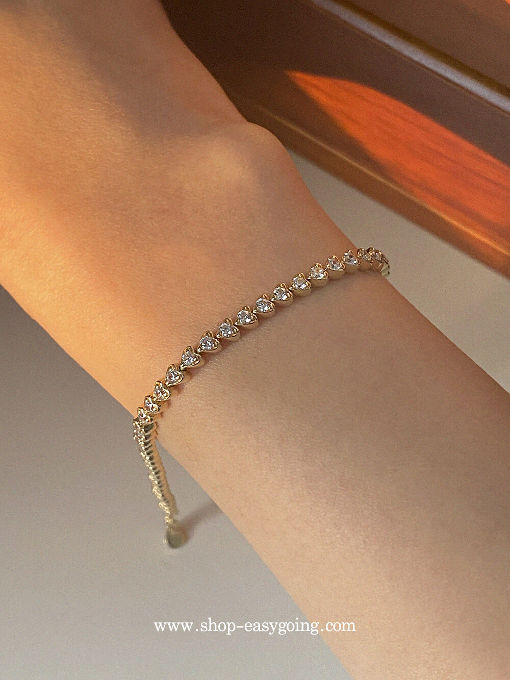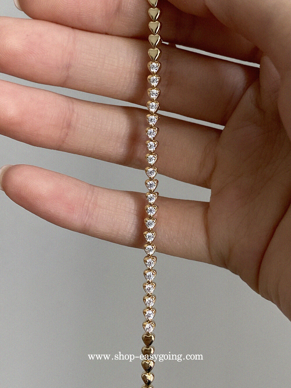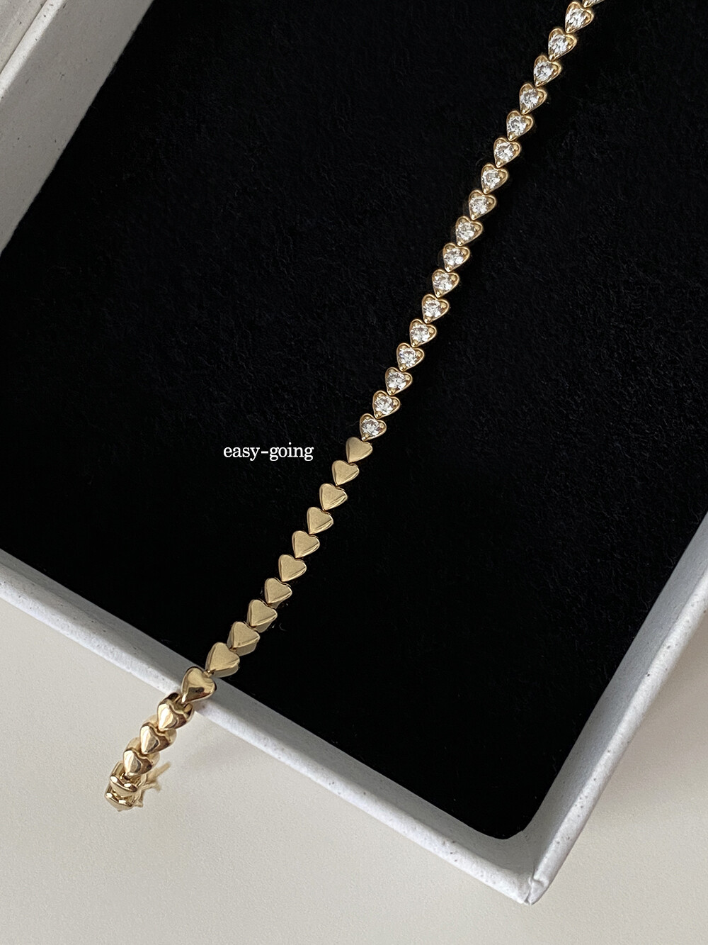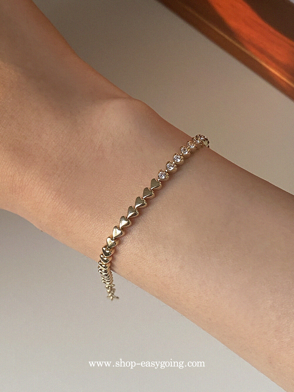 - 러블리한 미니하트가 쪼르르 이어진 팔찌예요 중앙 부분은 큐빅이 세팅되어 테니스 팔찌 느낌도 나는 제품이였어요 하트 안쪽은 비워서 중량은 낮춰주었습니다