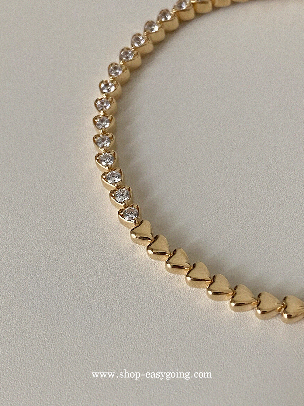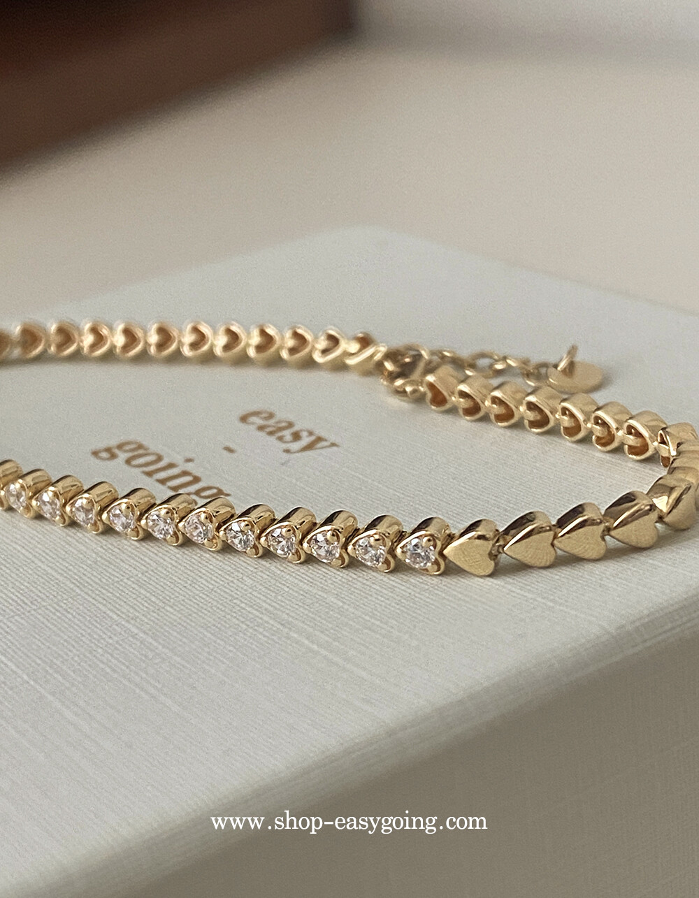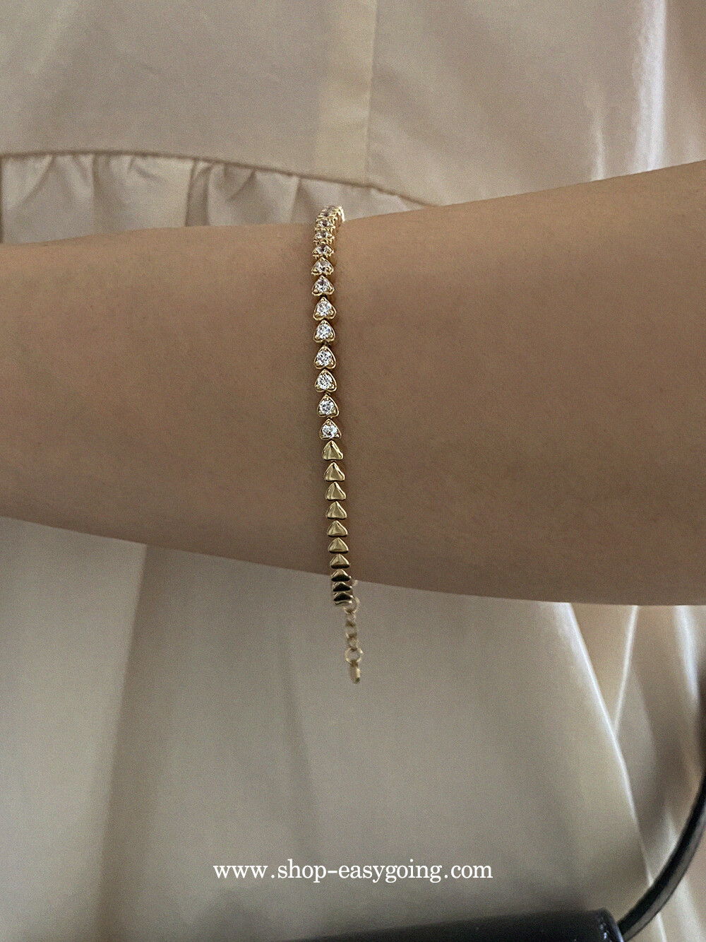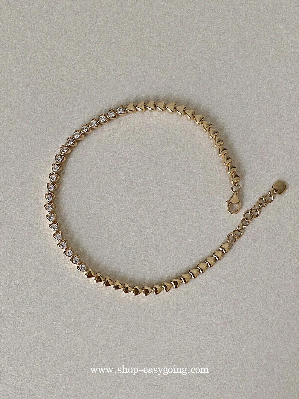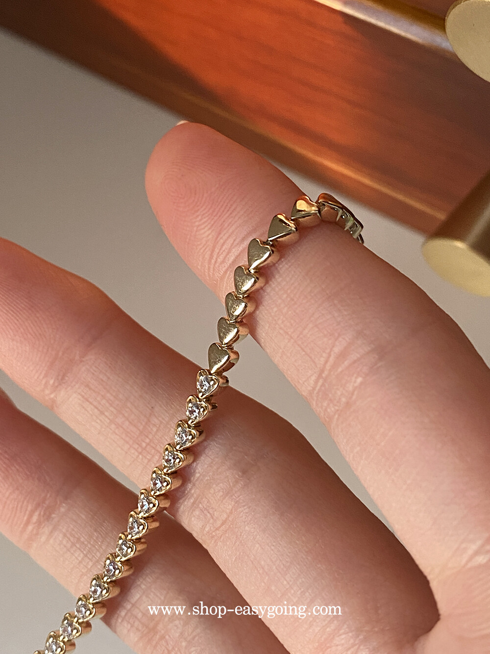 - 러블리한 미니하트가 쪼르르 이어진 팔찌예요 중앙 부분은 큐빅이 세팅되어 테니스 팔찌 느낌도 나는 제품이였어요 하트 안쪽은 비워서 중량은 낮춰주었습니다