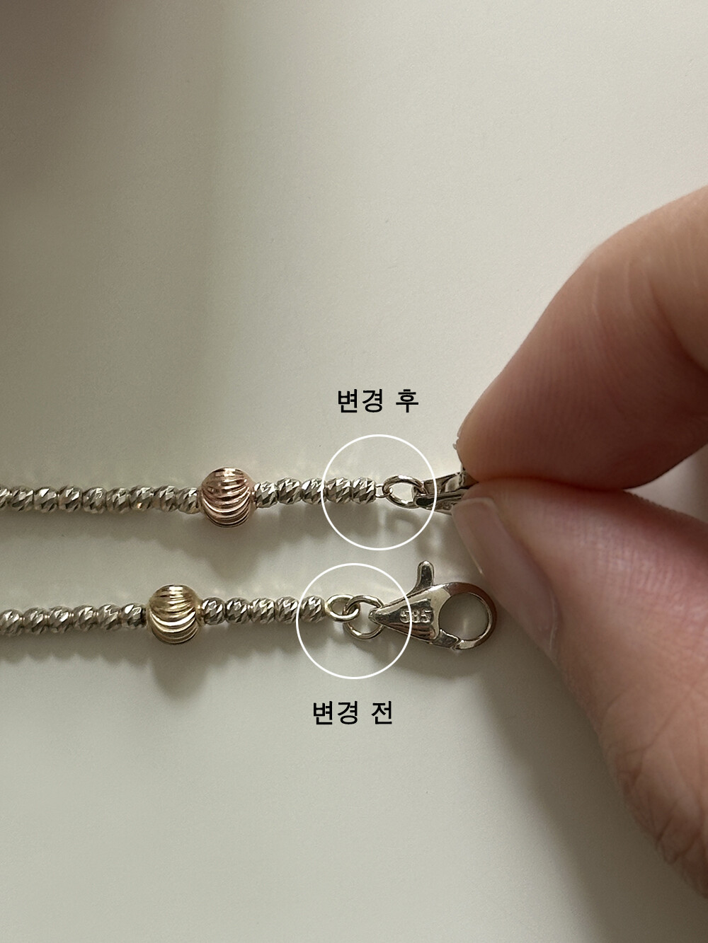 - 여유체인 끝 딸랑이는 납작하트로 제작됩니다(화이트+골드(큰볼) 사진 참고)