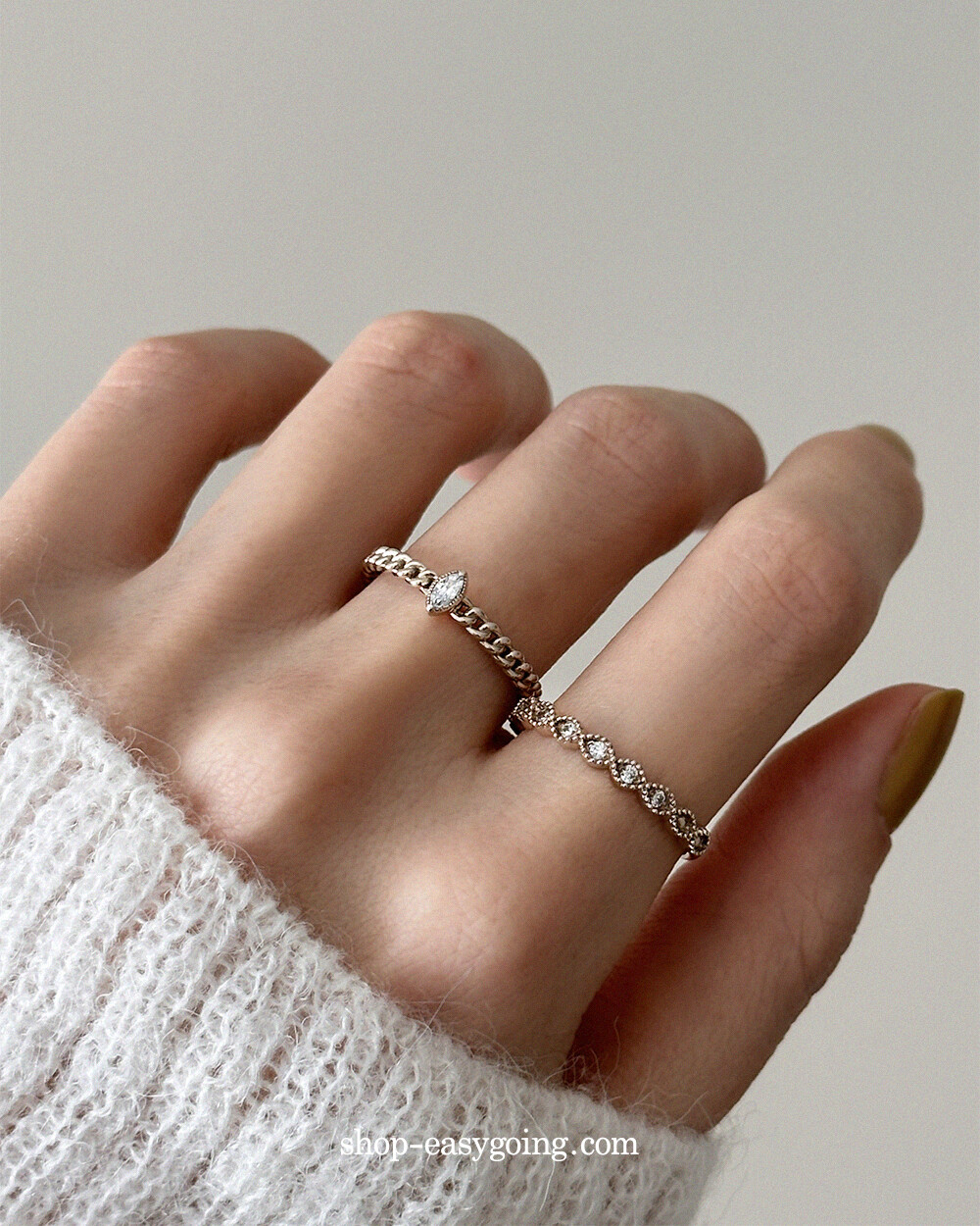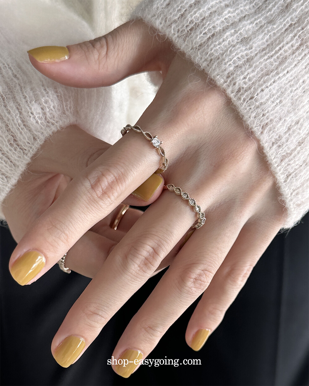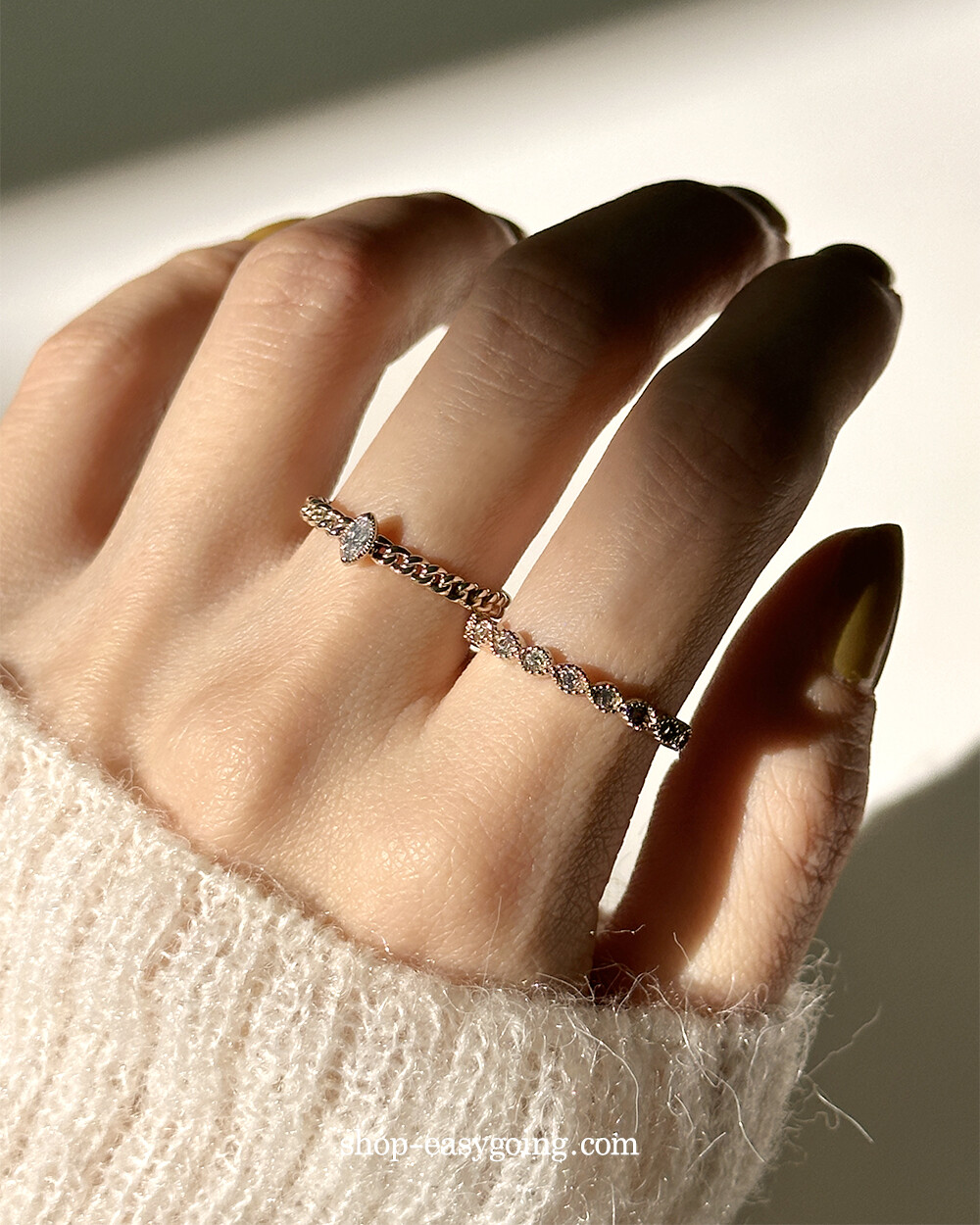 - 단독으로 또는 레이어드 해서 두루두루 매치하기 좋은 반지들이예요 큐빅 포인트로 잔잔하게 화사함도 주었고요 데일리로 편안하게 착용하기 좋으실 거예요 촬영 제품들은 모두 14k 화이트(무도금) 컬러인데요 빈티지한 느낌도 들면서 디자인과 잘 어울렸어요♡