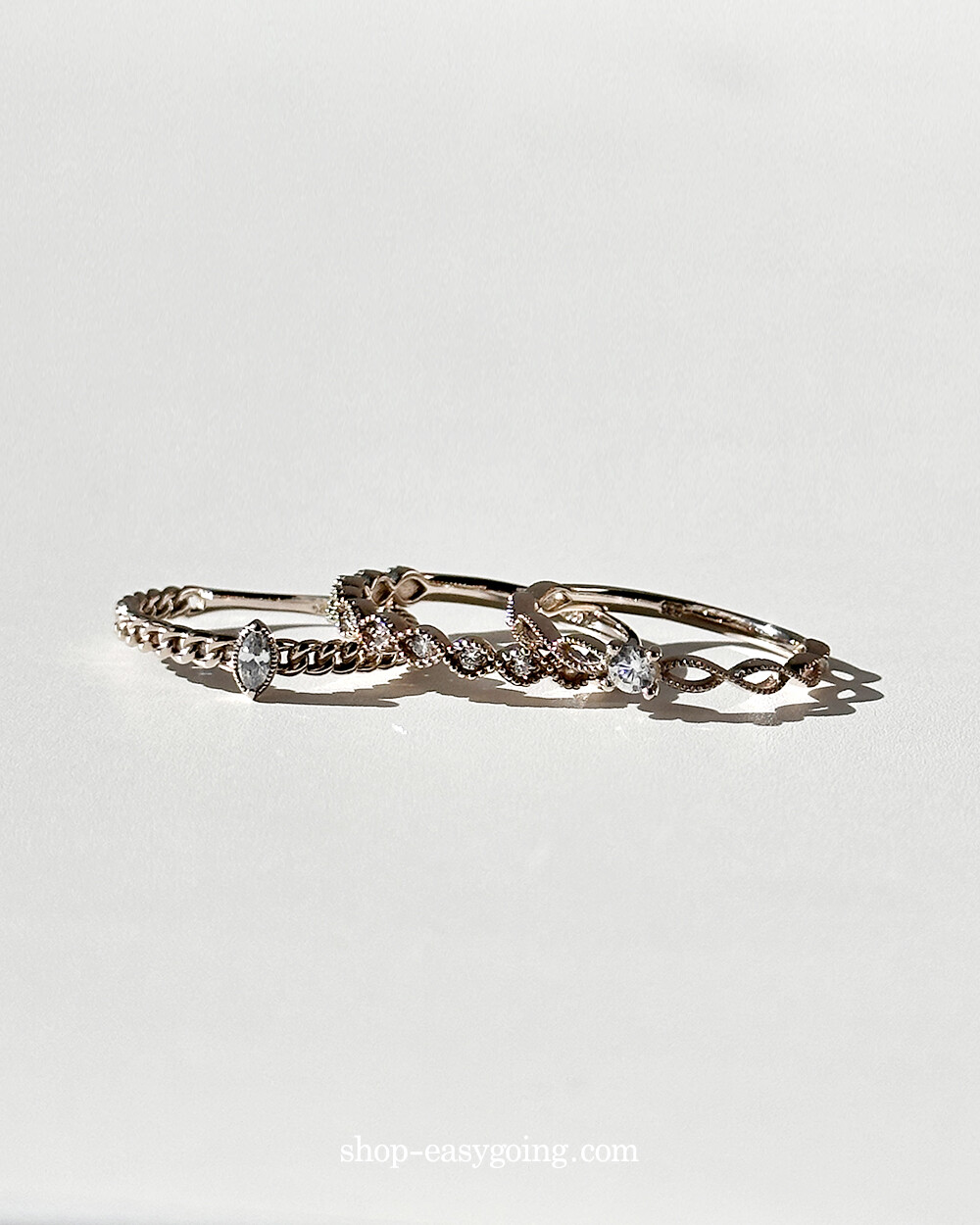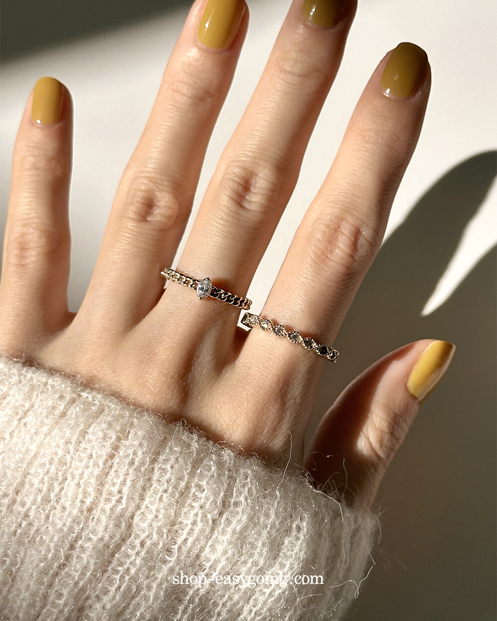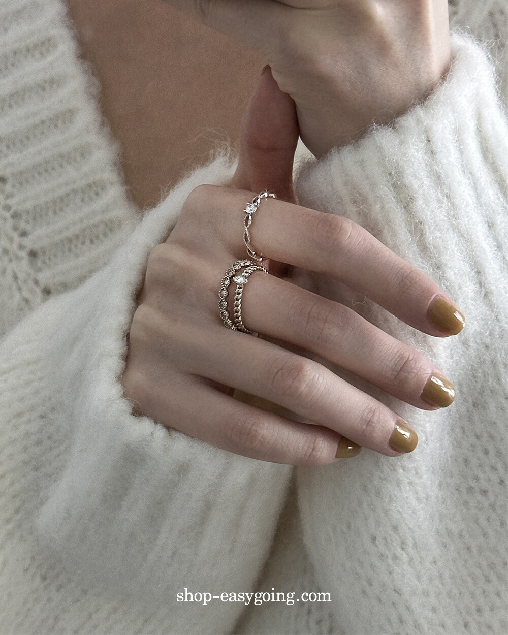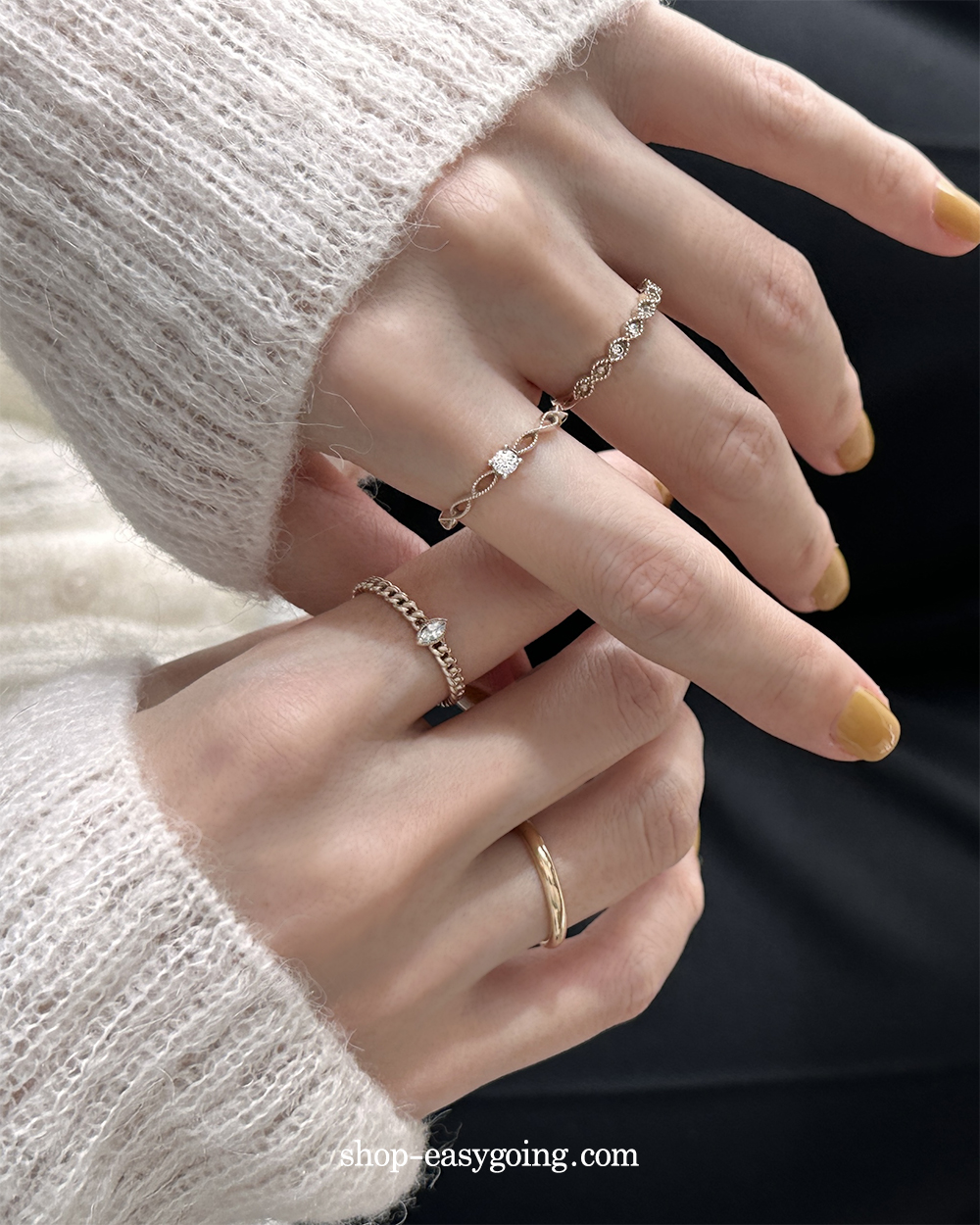 - 단독으로 또는 레이어드 해서 두루두루 매치하기 좋은 반지들이예요 큐빅 포인트로 잔잔하게 화사함도 주었고요 데일리로 편안하게 착용하기 좋으실 거예요 촬영 제품들은 모두 14k 화이트(무도금) 컬러인데요 빈티지한 느낌도 들면서 디자인과 잘 어울렸어요♡