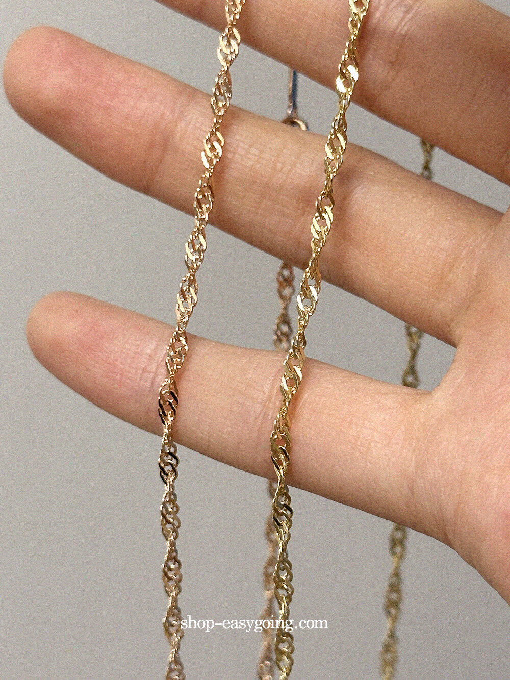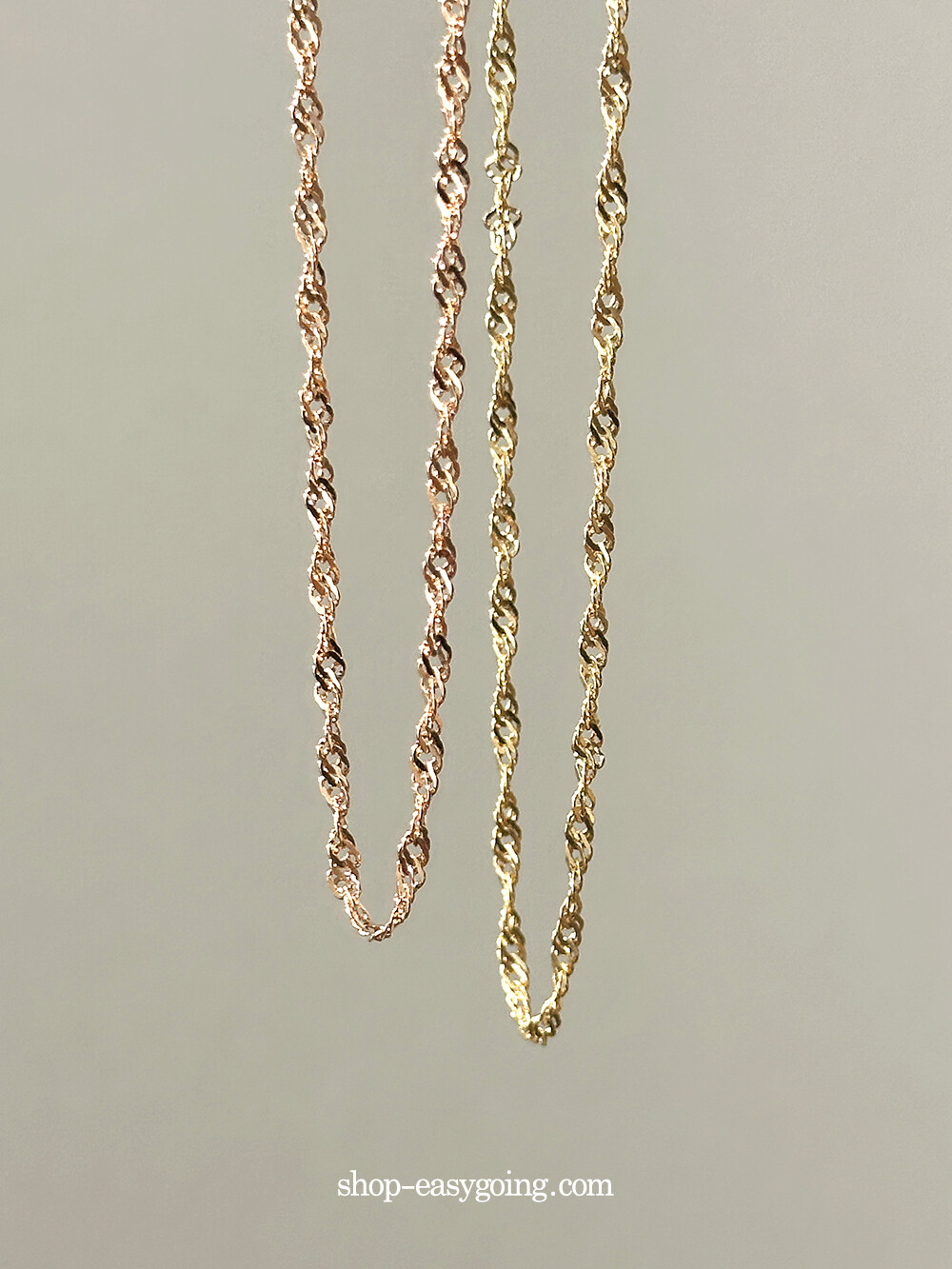 - 당겨졌을 때 꼬임이 생기는 독특한 체인이에요 1돈 굵기라 착용했을 때 확실하게 포인트가 되어주는 제품이랍니다 (1돈 굵기는 중량 1돈이 아닙니다 길이마다 오차 발생하는 제품이에요)
