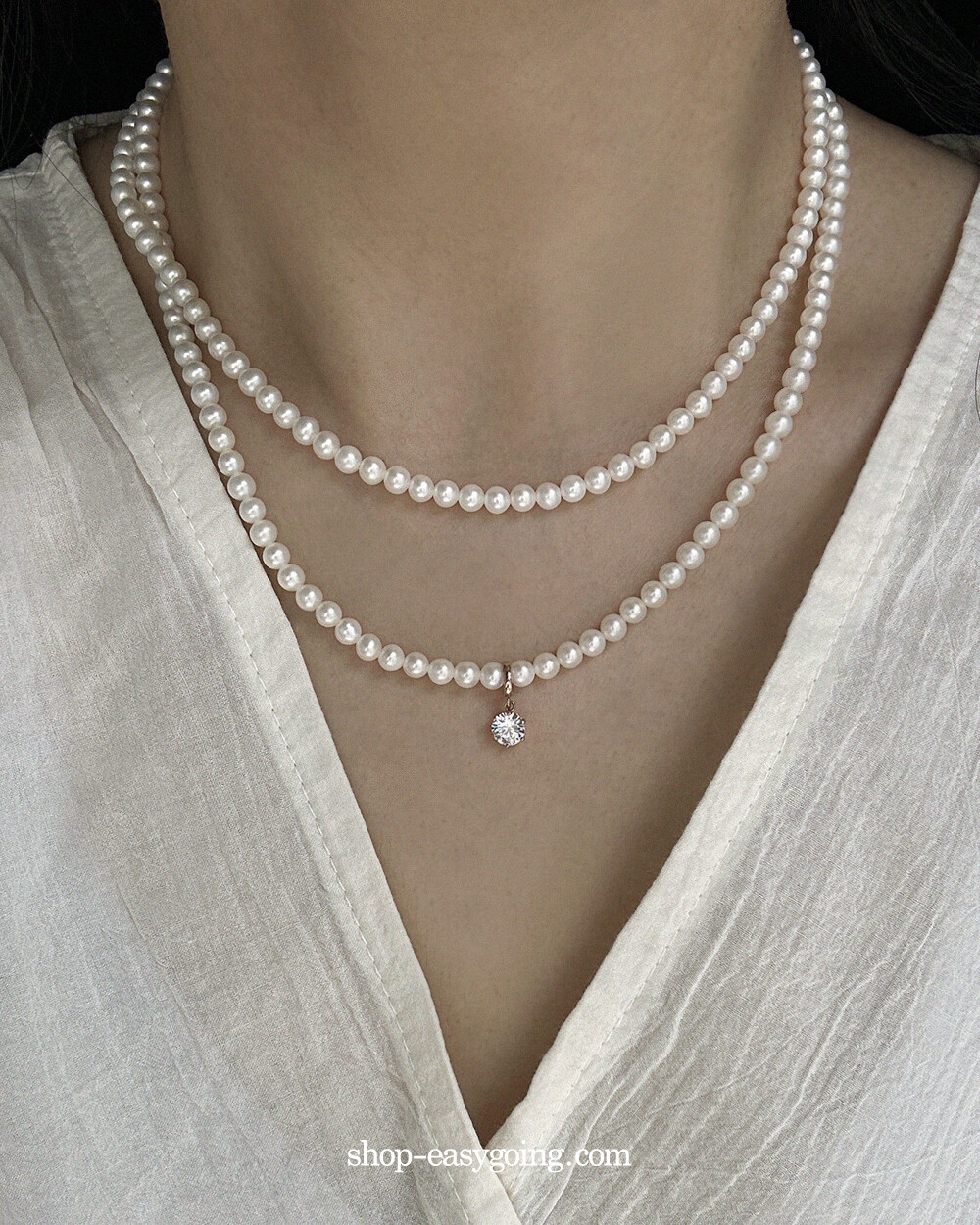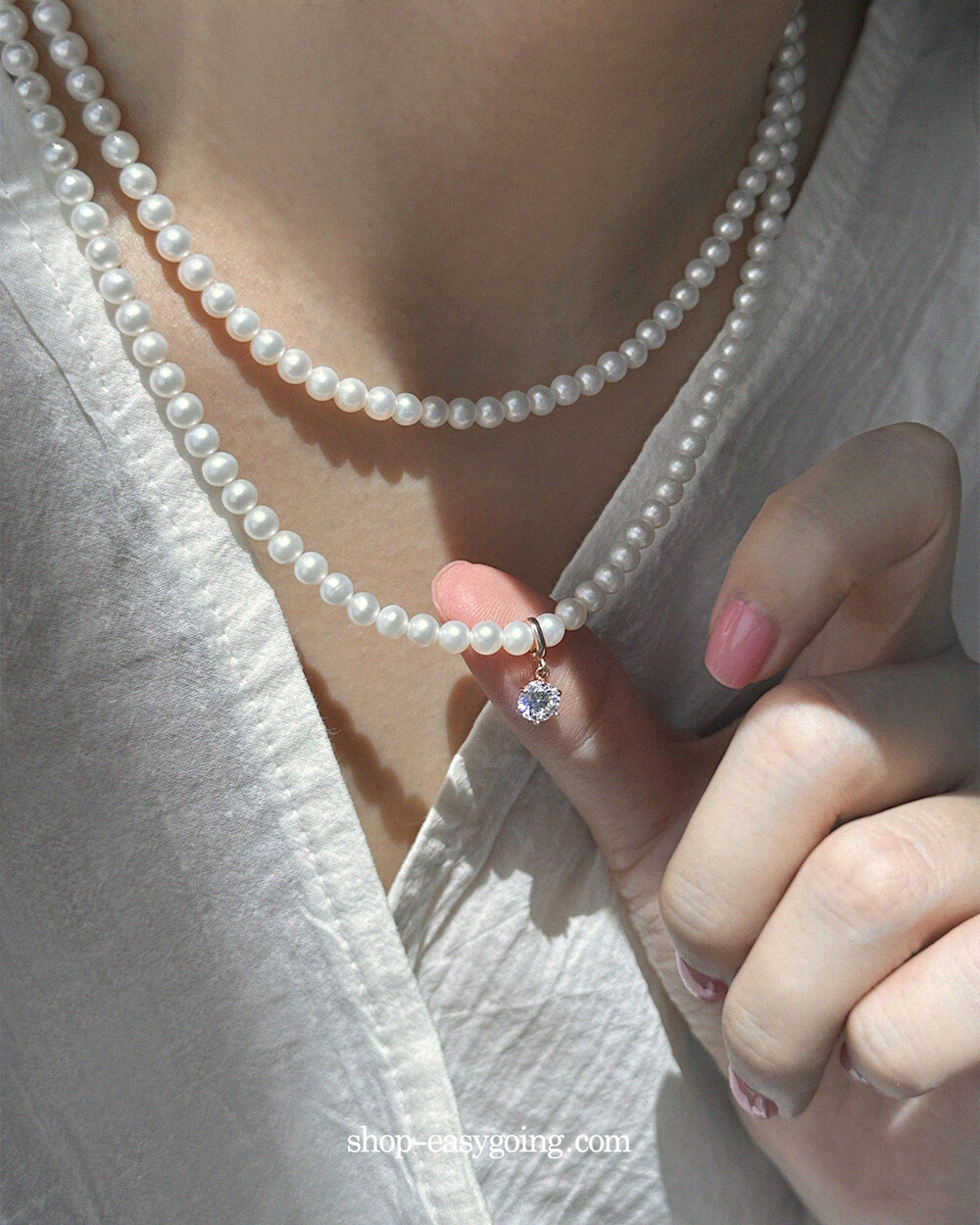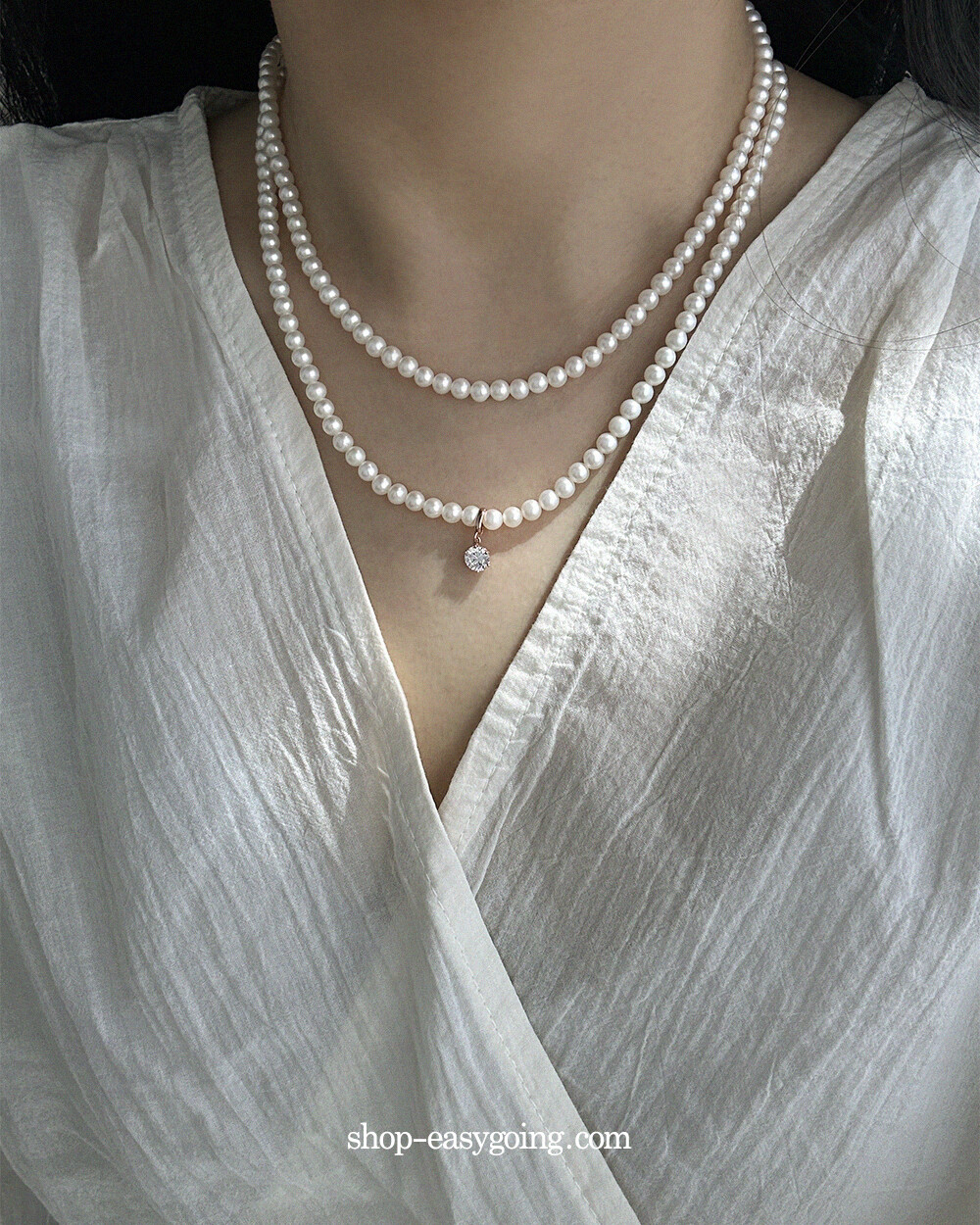 - 진주목걸이에 걸어주실때 진주 사이를 살짝 벌려서 연결해 주세요 (틈이 여유없거나 진주 사이즈가 클 경우 연결이 되지 않습니다 / 촬영 제품은 4mm 진주입니다)