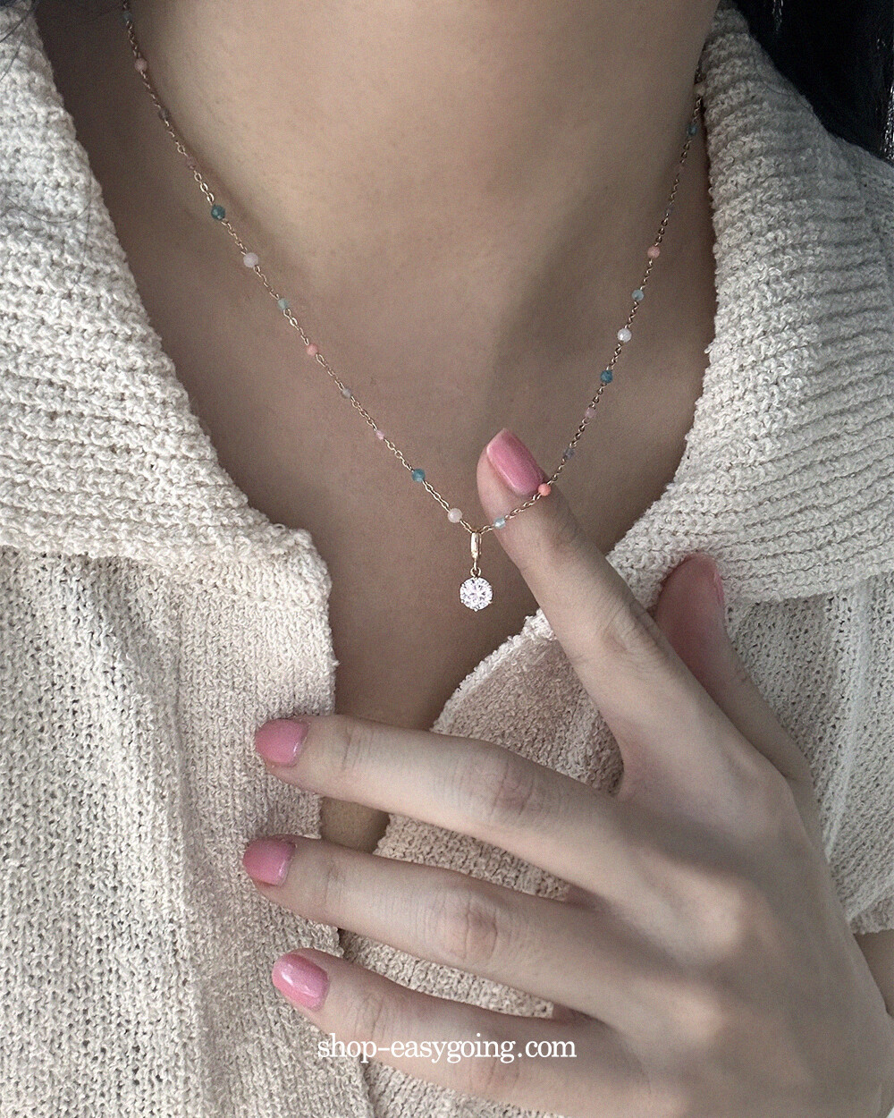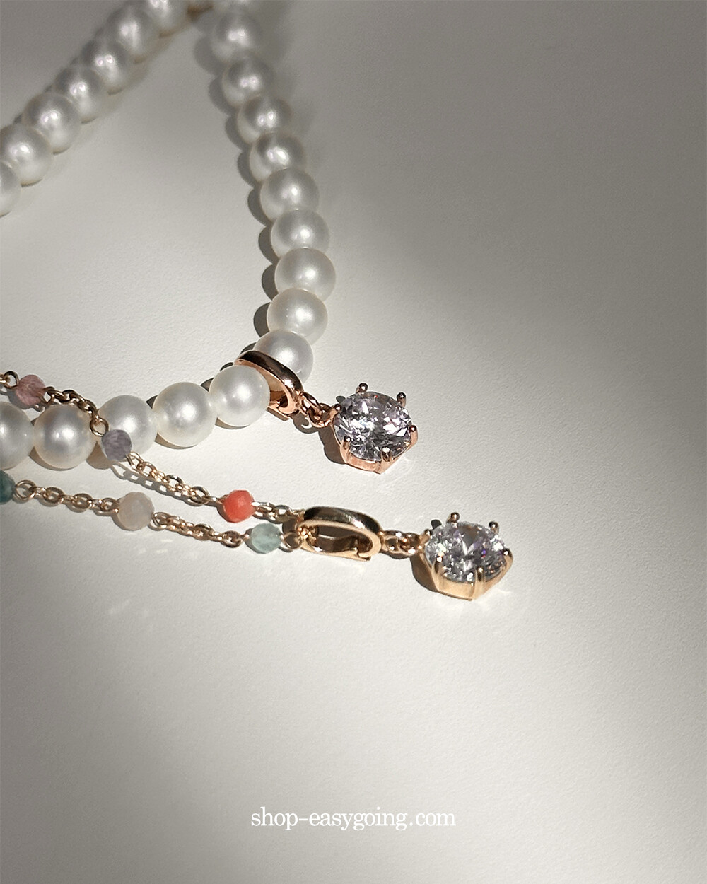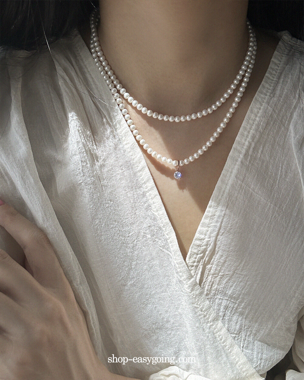 - 진주목걸이에 걸어주실때 진주 사이를 살짝 벌려서 연결해 주세요 (틈이 여유없거나 진주 사이즈가 클 경우 연결이 되지 않습니다 / 촬영 제품은 4mm 진주입니다)