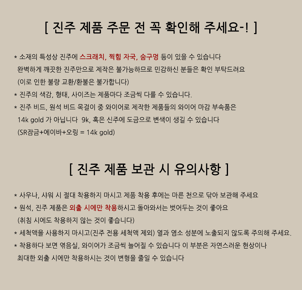천연석, 진주 : 소재 특성상 미세한 스크래치, 형태의 차이가 있을 수 있습니다. 세척액을 사용하지 마시고(진주:진주전용세척액 제외) 열과 염소성분에 노출되지 않도록 주의해주세요. 직사광선에 오랜시간 노출되면 손상될 수 있습니다 (사우나, 샤워시 절대 착용하지 마시고 제품 착용 후에는 마른 천으로 닦아 보관해주세요) / 진주 비드, 원석 비드 목걸이 중 와이어로 제작한 제품들의 와이어 마감 부속품은 14k gold 가 아닙니다.(공장에 따라 9k, 혹은 신주에 도금 / SR잠금+에이바+오링 = 14k gold)