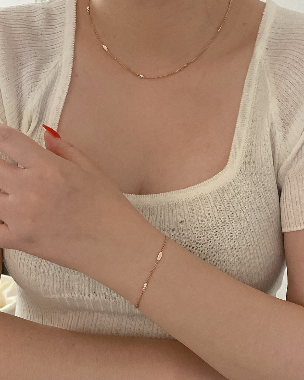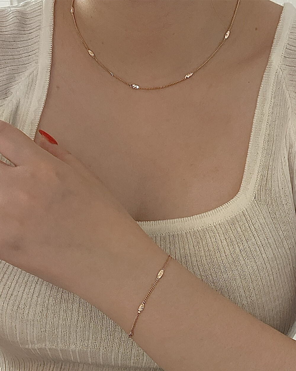 - 튼튼한 7푼 민줄에 컷팅장식으로 포인트를 주었어요 은은한 반짝임이 있어 단품으로 착용해도 심심하지 않고 매끄러운 민줄체인으로 착용감도 편안해서 데일리 주얼리로 추천드립니다:)- 심플한 스타일로 유행과 상관없이 오래오래 손이 많이 가실 거에요 팔찌+목걸이 세트로 착용하셔도 부담스럽지 않고 딱 깔끔하고 세련된 느낌으로 고급스럽답니다