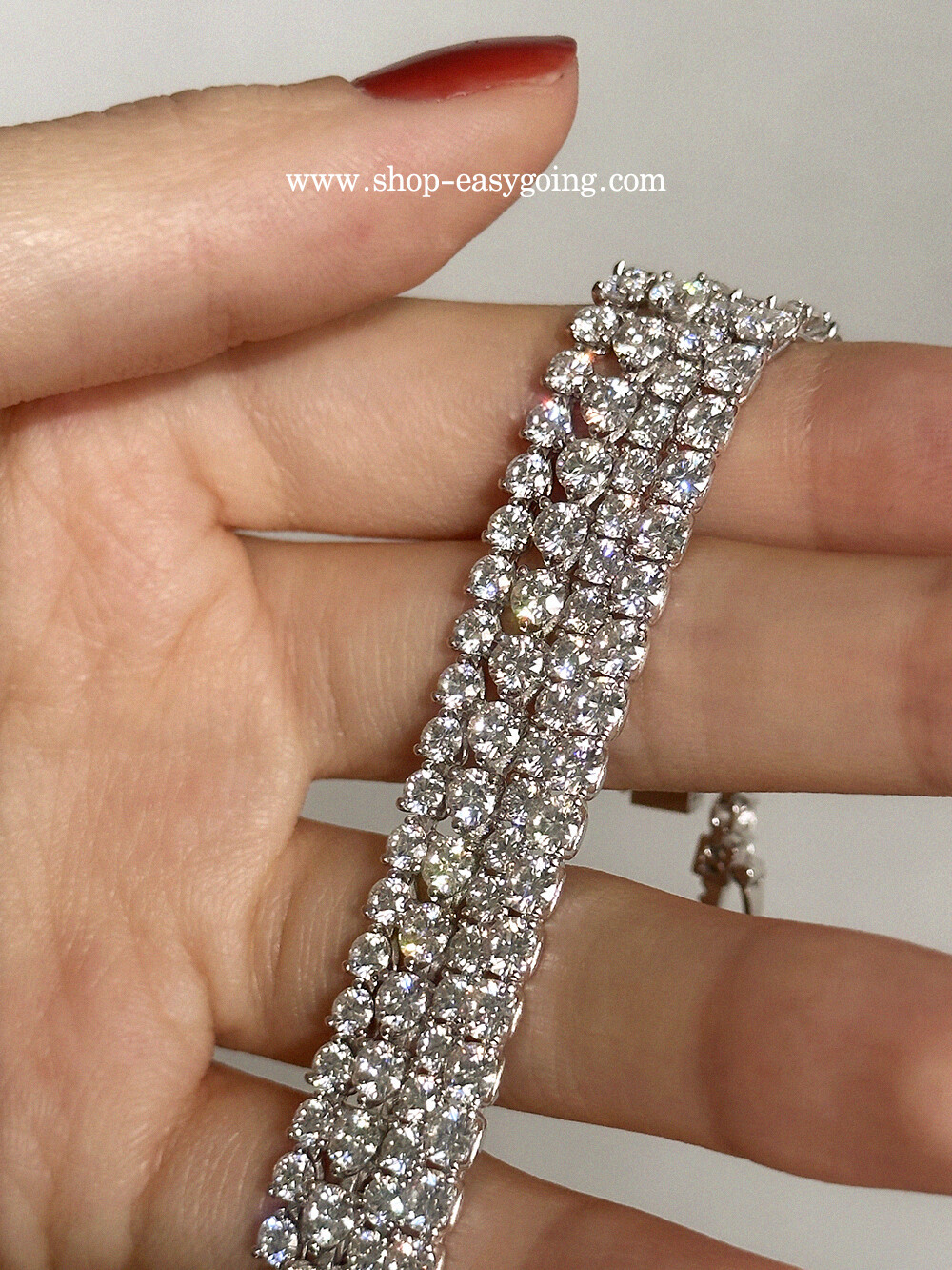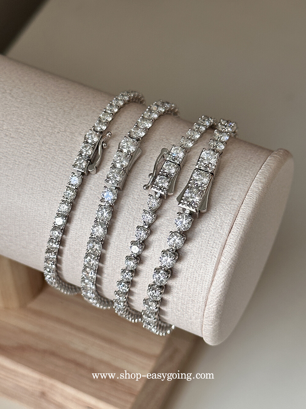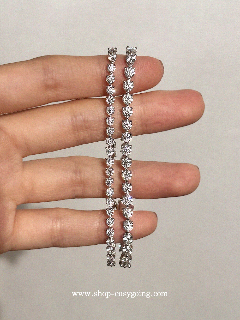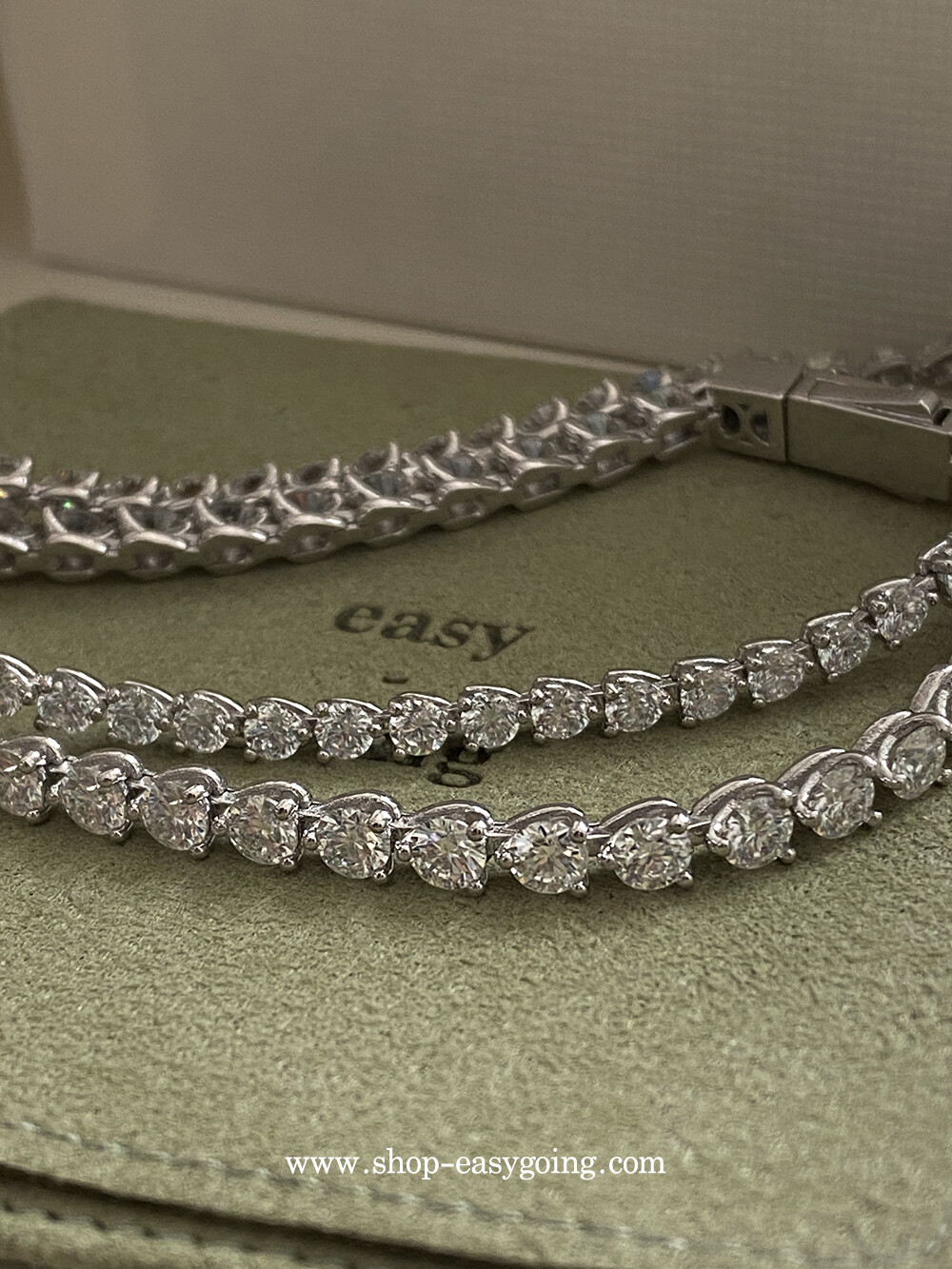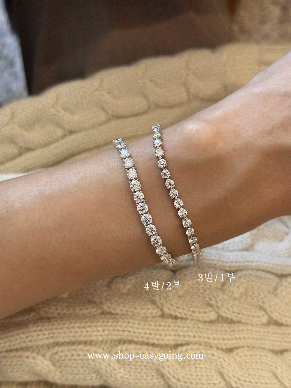 - 다이아몬드 대용으로 사용되는 모이사나이트로 제작한 테니스 팔찌예요 다이아와 거의 비슷한 반짝임과 강도로 오래도록 착용하기 좋은 소장가치가 있는 제품입니다 (큐빅은 강도가 약해 오래 사용하면 겉면 기스로 인해 빛이 약해지지만 모이사나이트는 반짝임을 오래도록 유지합니다)