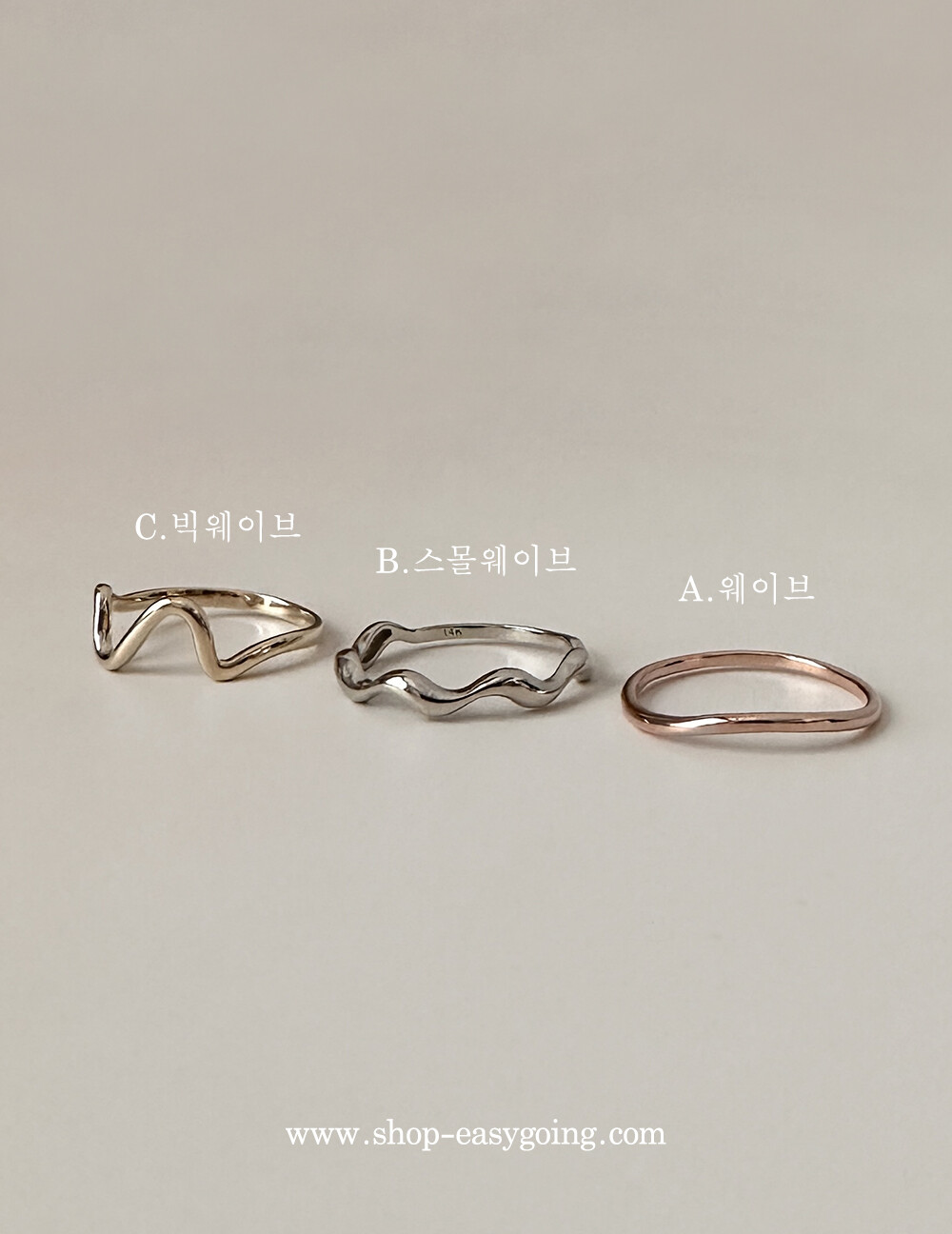 - A.웨이브 제품은 14k 핑크 / B.스몰웨이브 제품은 14k 화이트(무도금) / C.빅웨이브 제품은 14k 골드 컬러입니다.