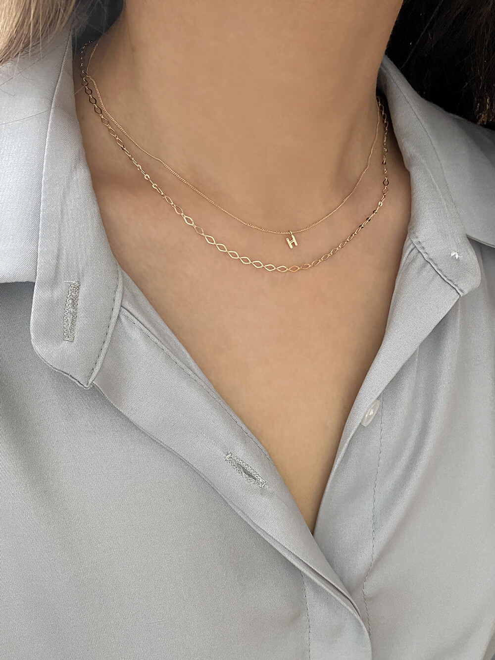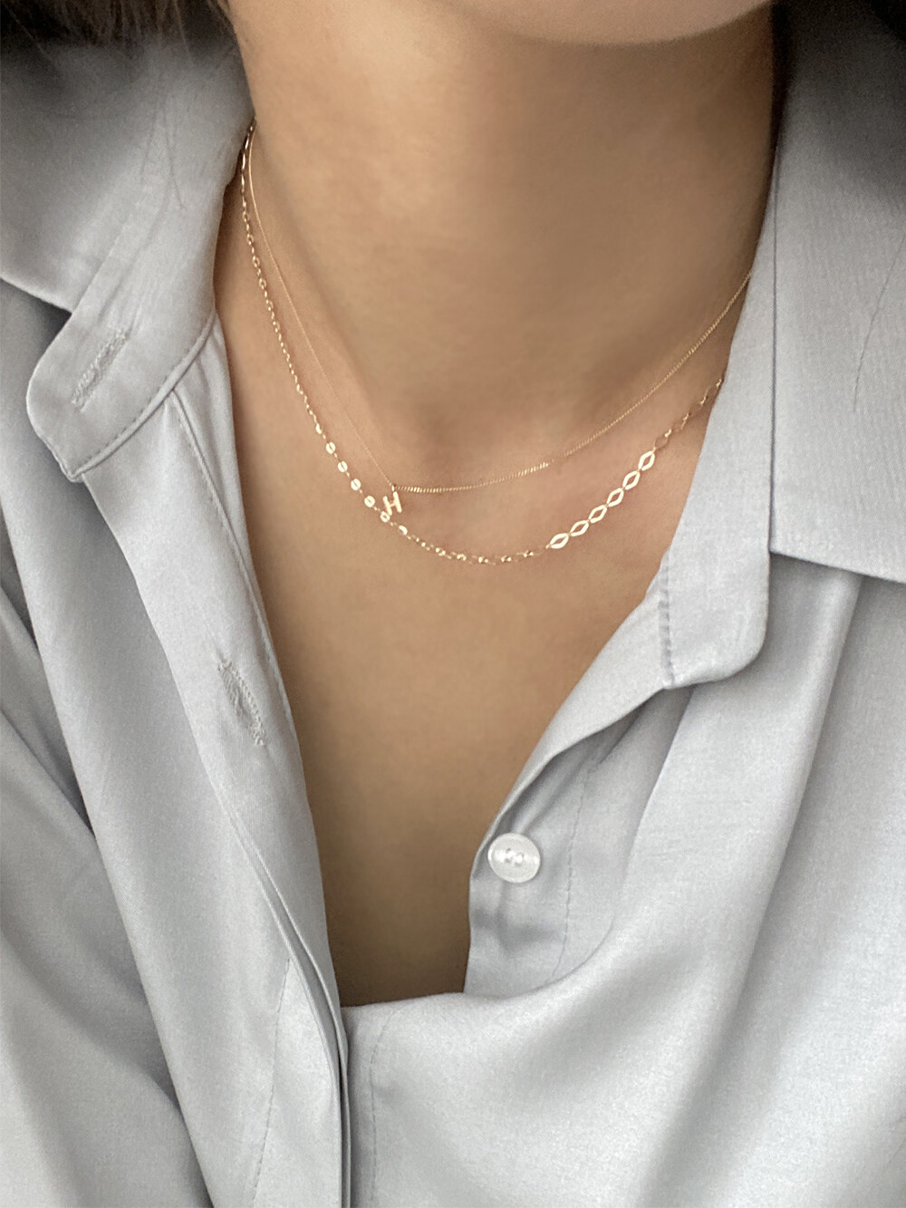 - 목걸이 체인은 2푼으로 얇고 여리여리한 분위기가 연출되어요 데일리로 편하게 착용하기 좋은 스타일입니다.